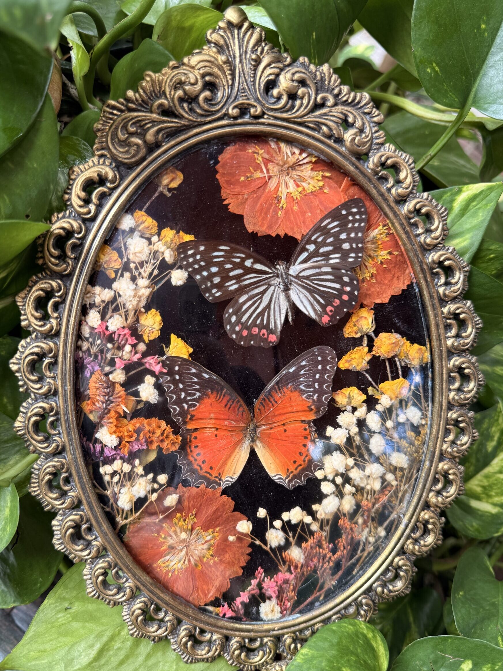 Monarchs in Small Antique Frame with Orange Flowers