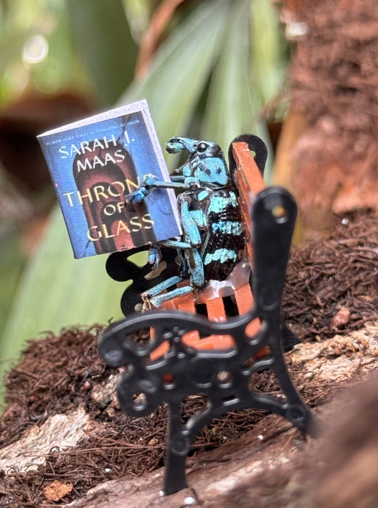 A turquoise weevil relaxes on a park bench, completely absorbed in its tiny copy of Throne of Glass.Read more -