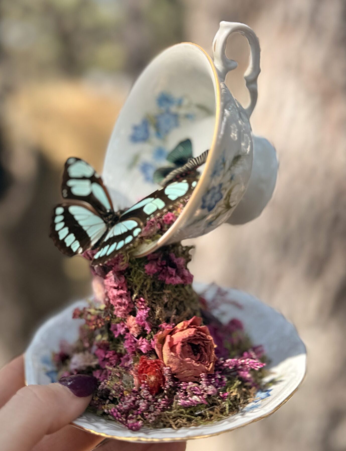 A floating teacup pours out a cascade of moss, blooms, and butterfly movement, with a Monarch and a Red Cracker poised mid-spell above a warm reclaimed wood base, turning a single impossible moment into a tiny enchanted world.Add to cart -