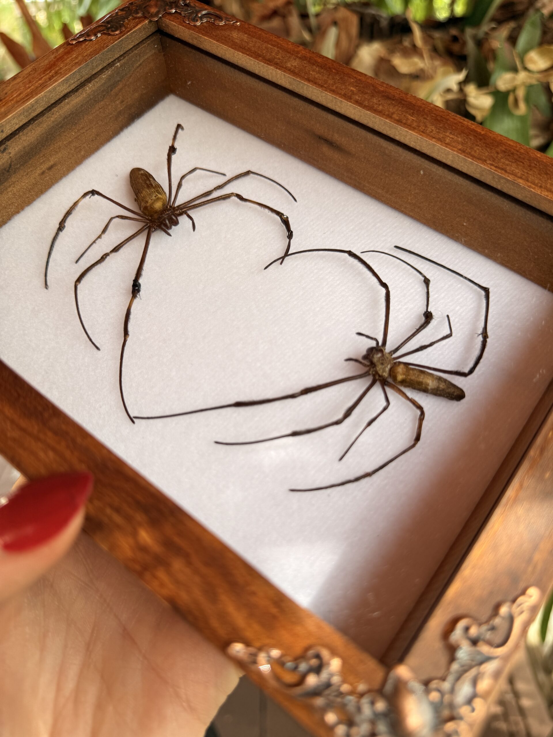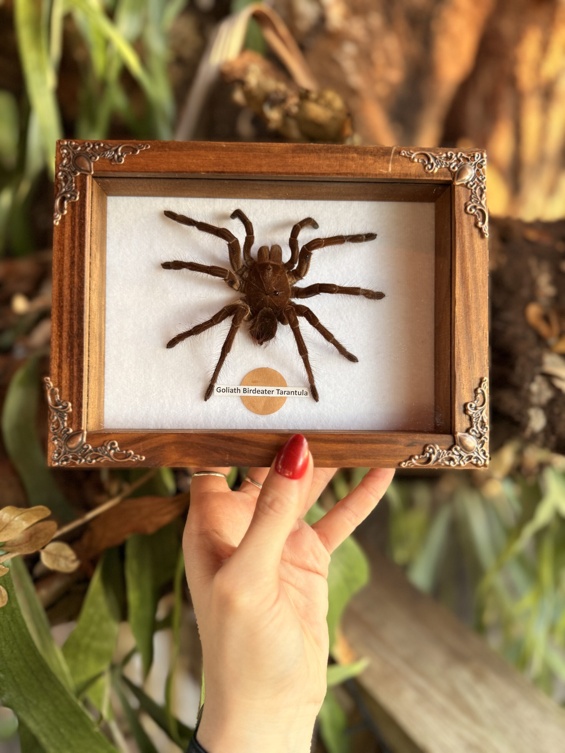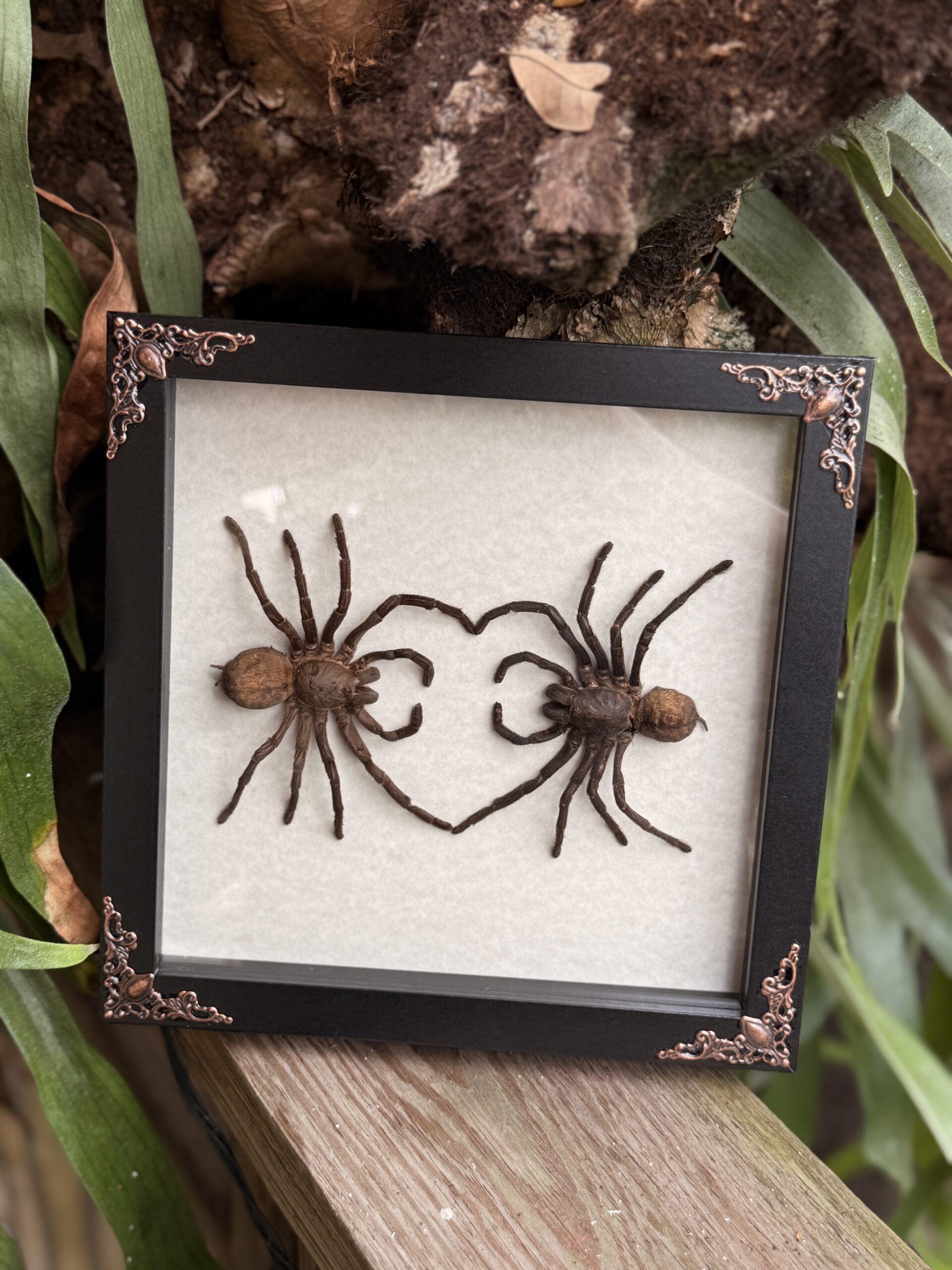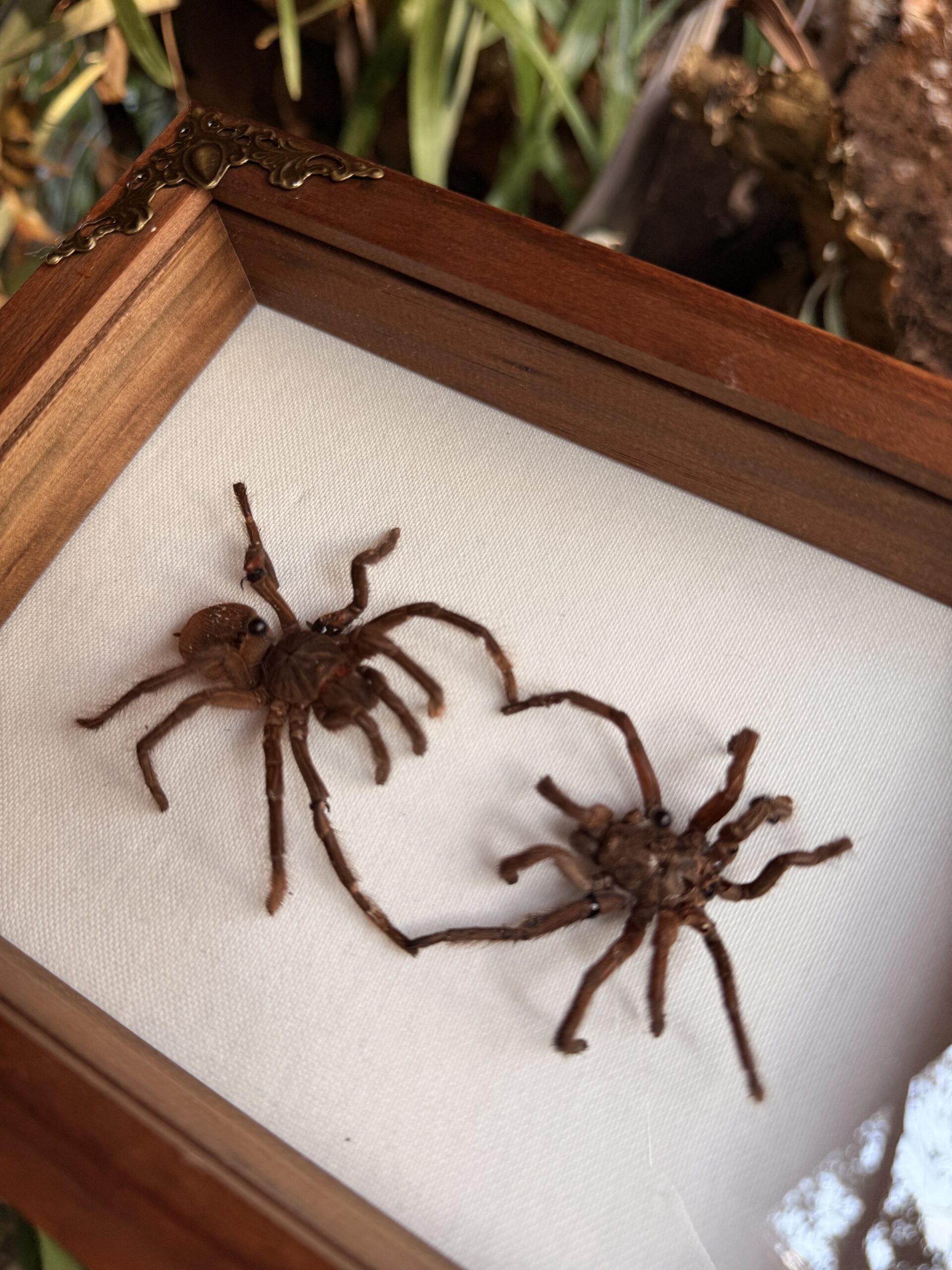 A single preserved tarantula presented in a minimalist walnut shadow box frame. Clean, simple, and deliberately understated.