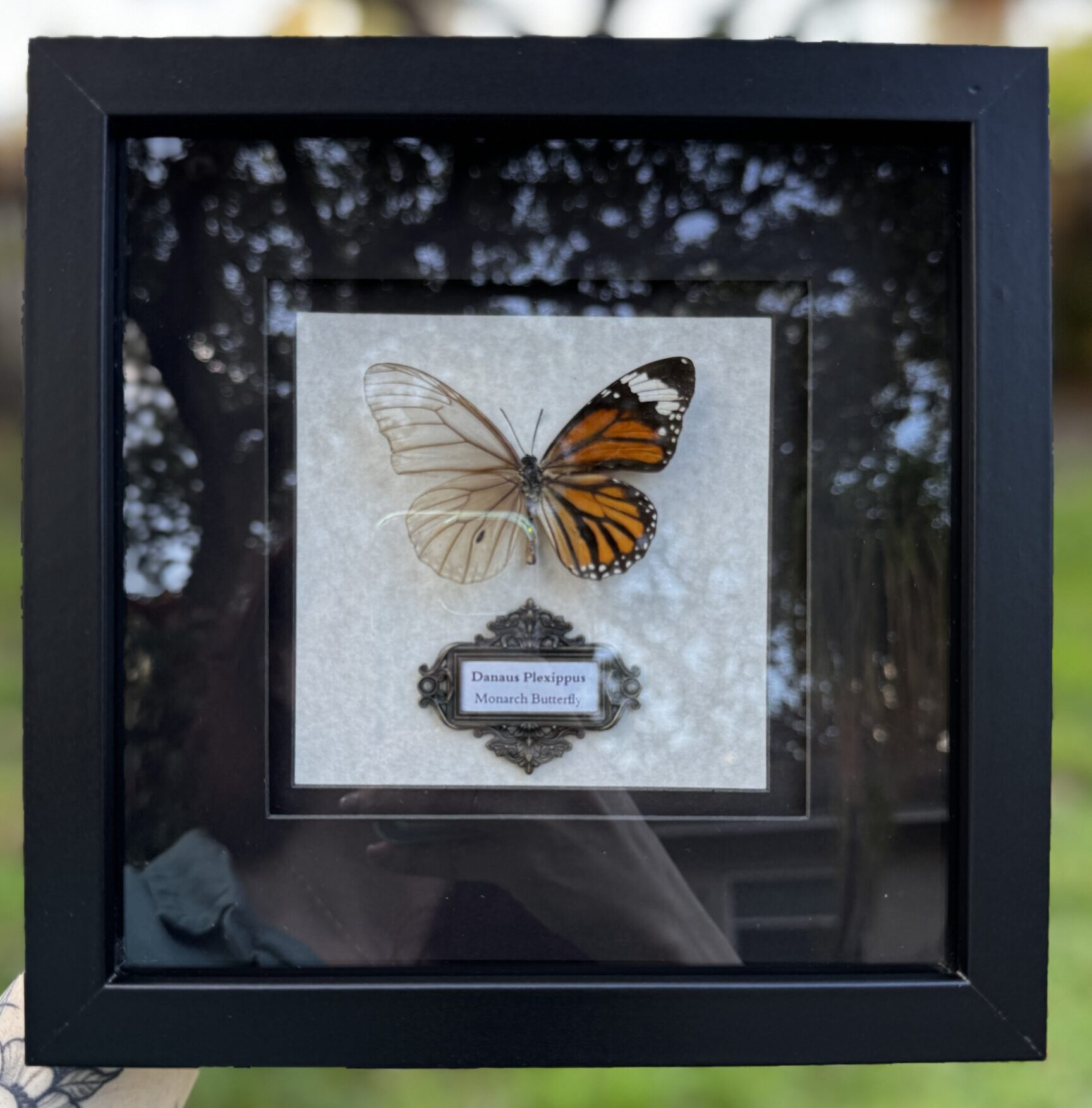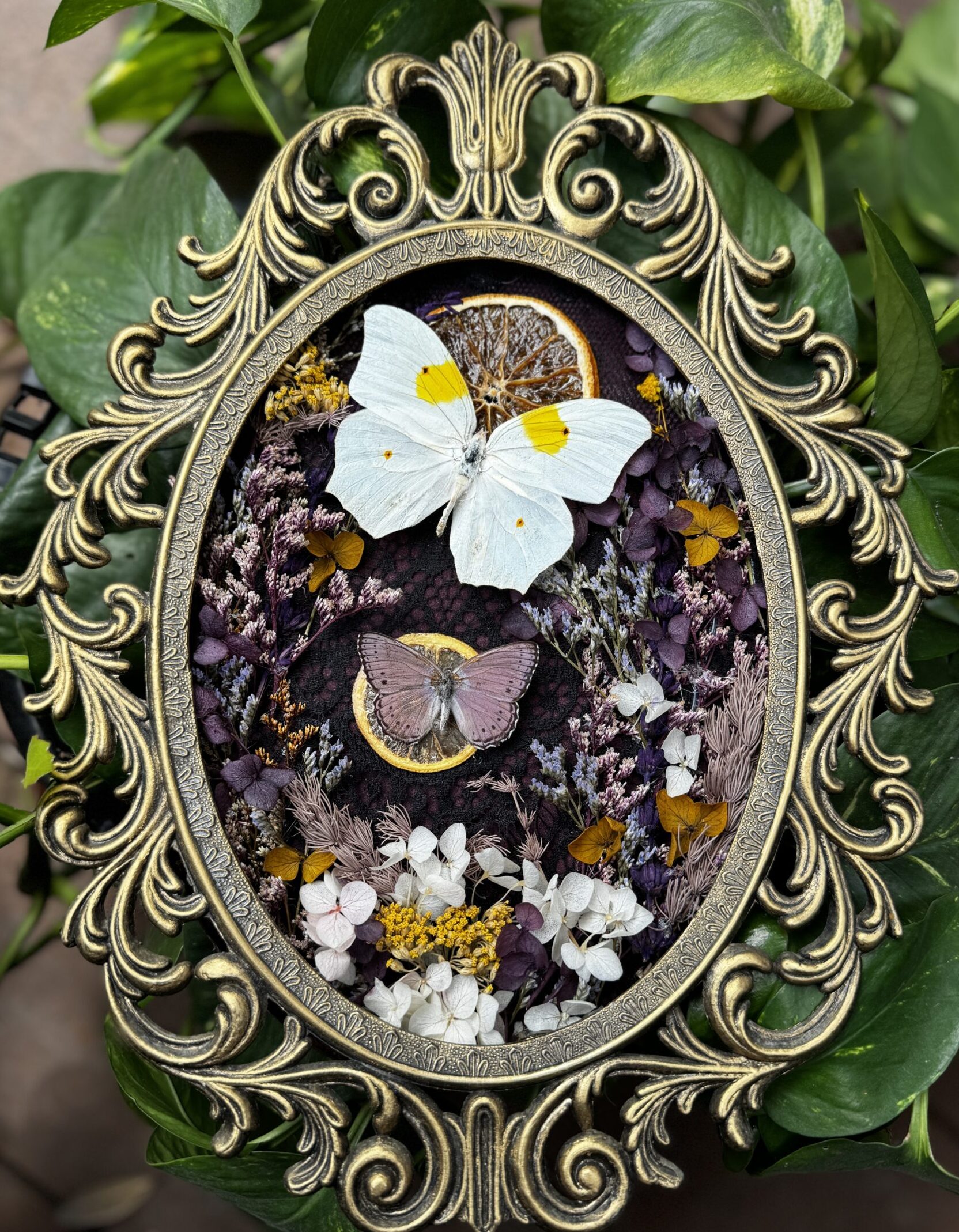 Real Preserved Spiderwebs in Antique Frame with Green Iridescent Mother of Pearl Butterfly