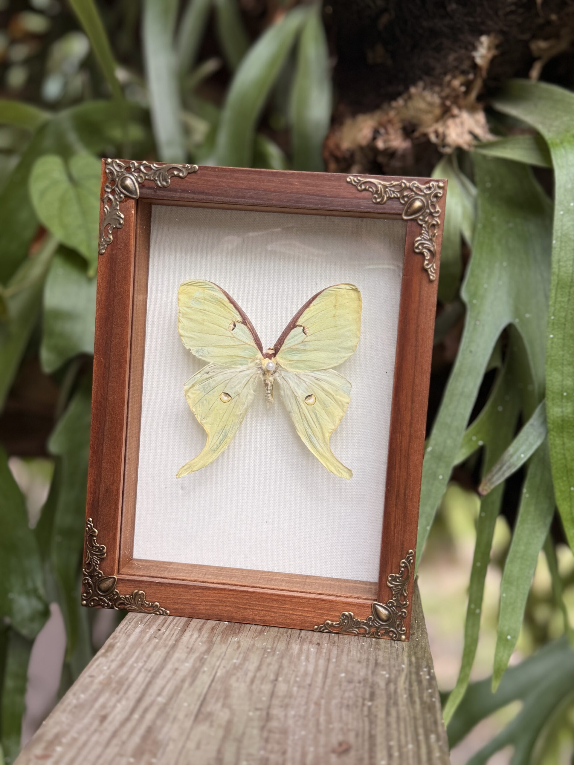 This specimen is presented in a minimalist walnut frame with subtle gold accents that highlight the moth’s natural elegance. Other frame styles are available upon request. A black or white minimalist shadowbox is also offered at the same price.