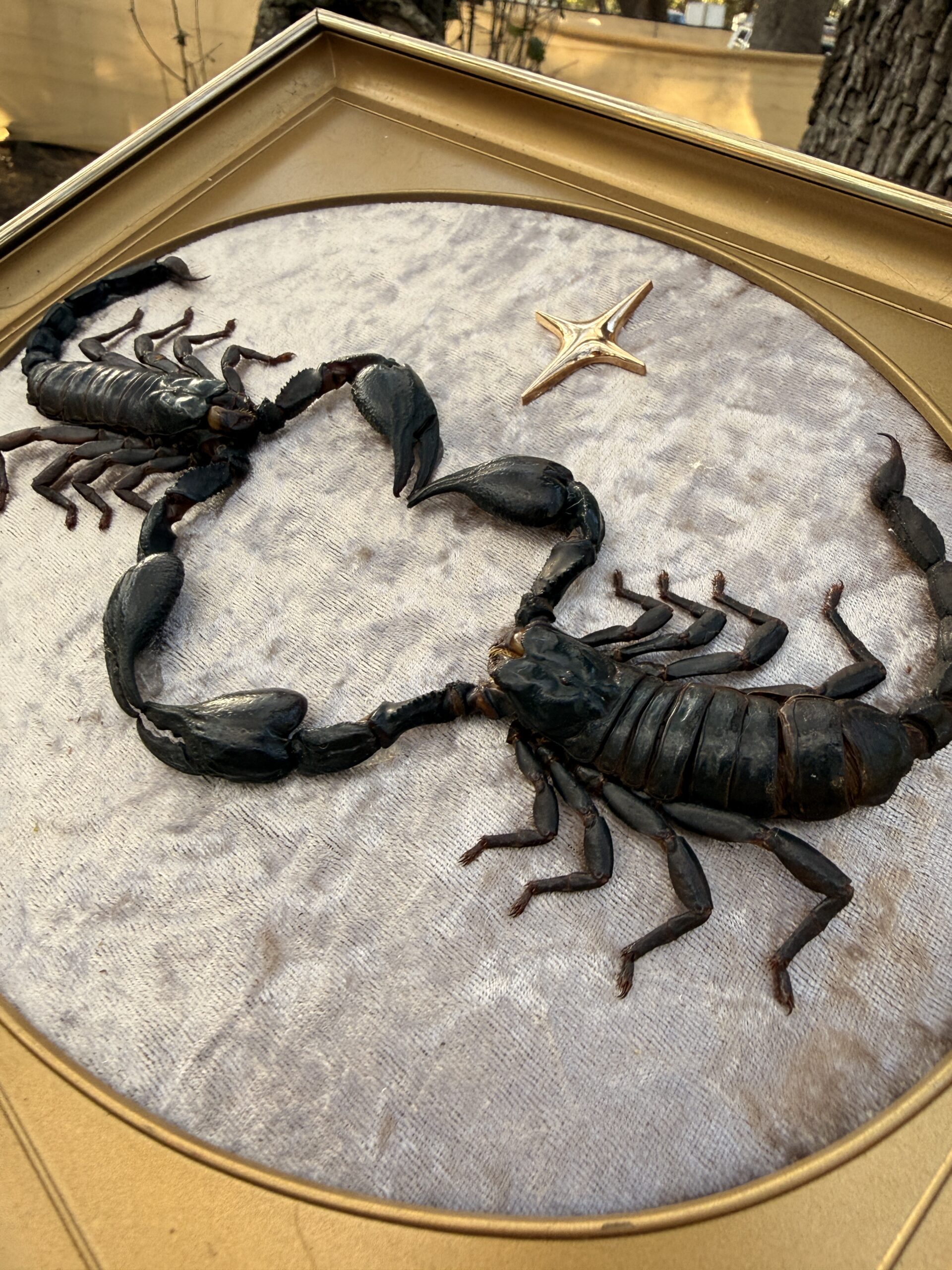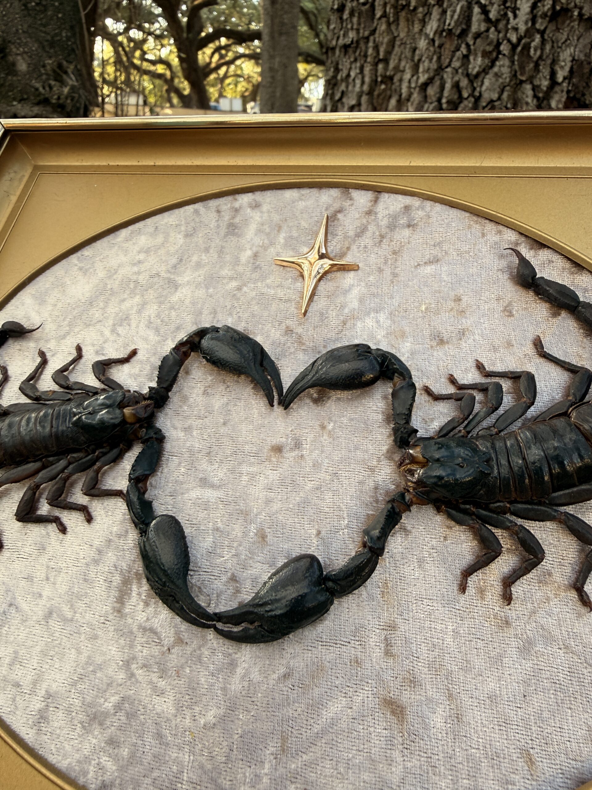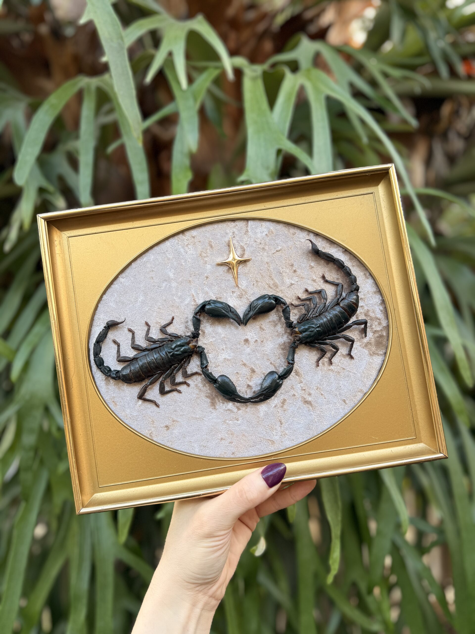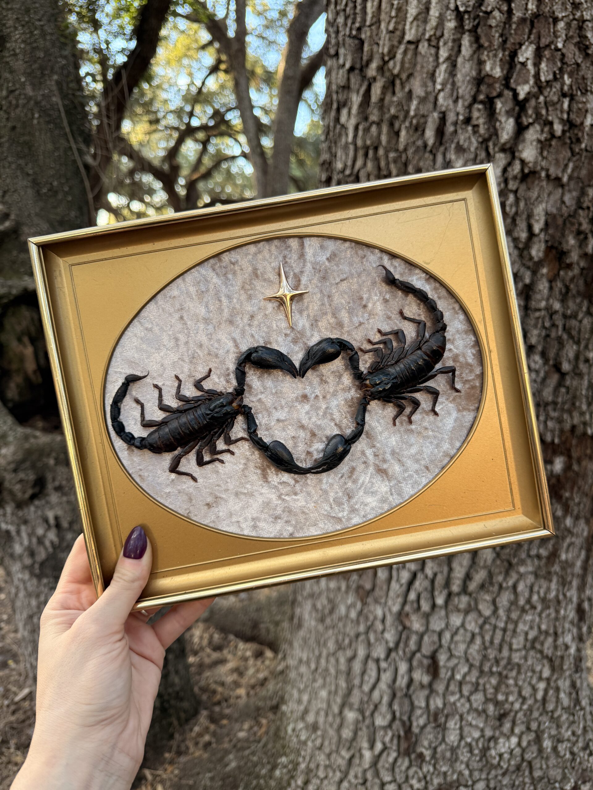 Two preserved scorpions curve toward each other to form a dark, striking heart at the center of this vintage gold mid century frame. Set against soft textured fabric with a single gold star above them, the piece has a dramatic but romantic feel that makes it both bold decor and a symbolic gift. Each specimen is ethically sourced and carefully mounted by hand.