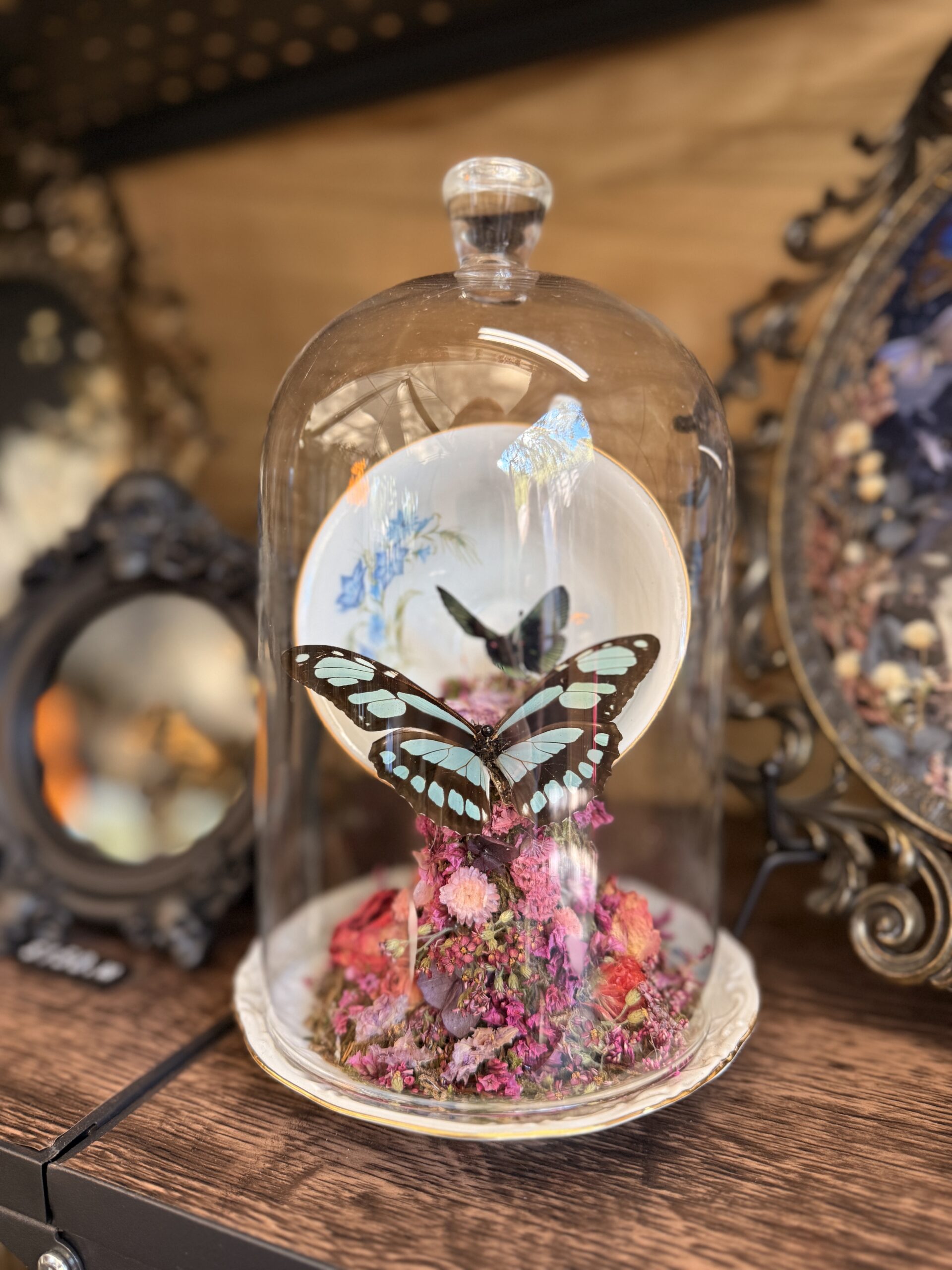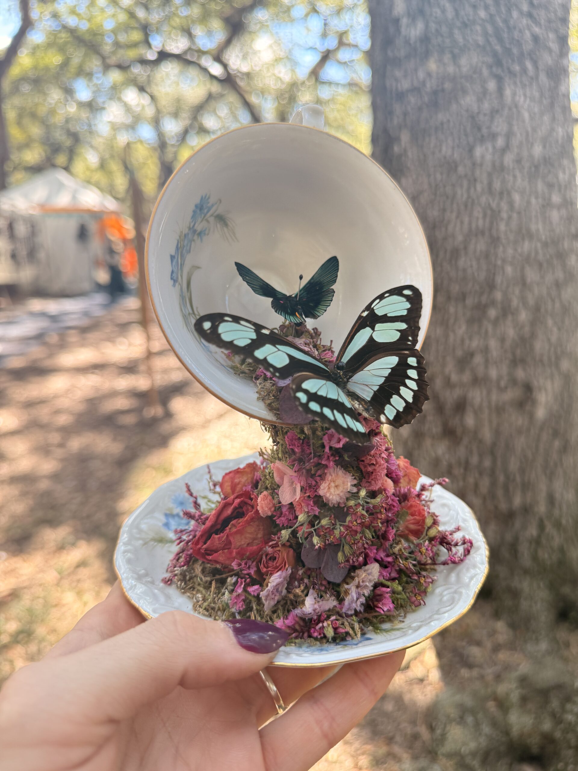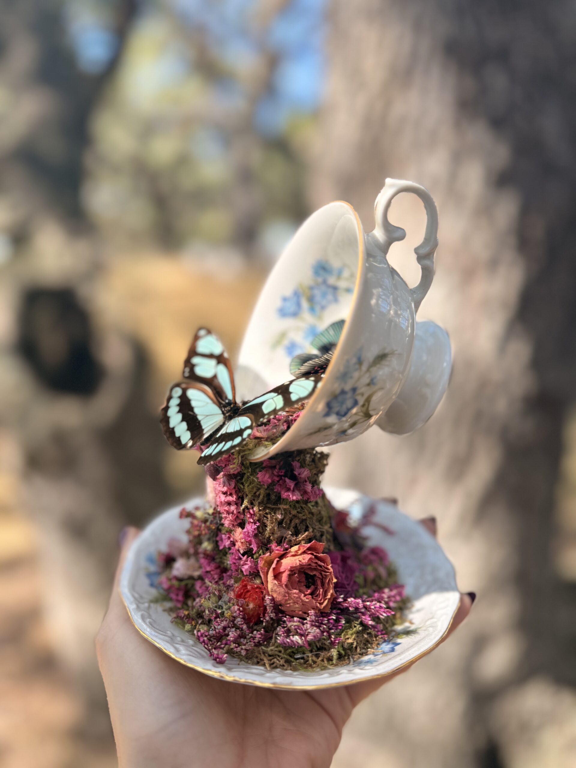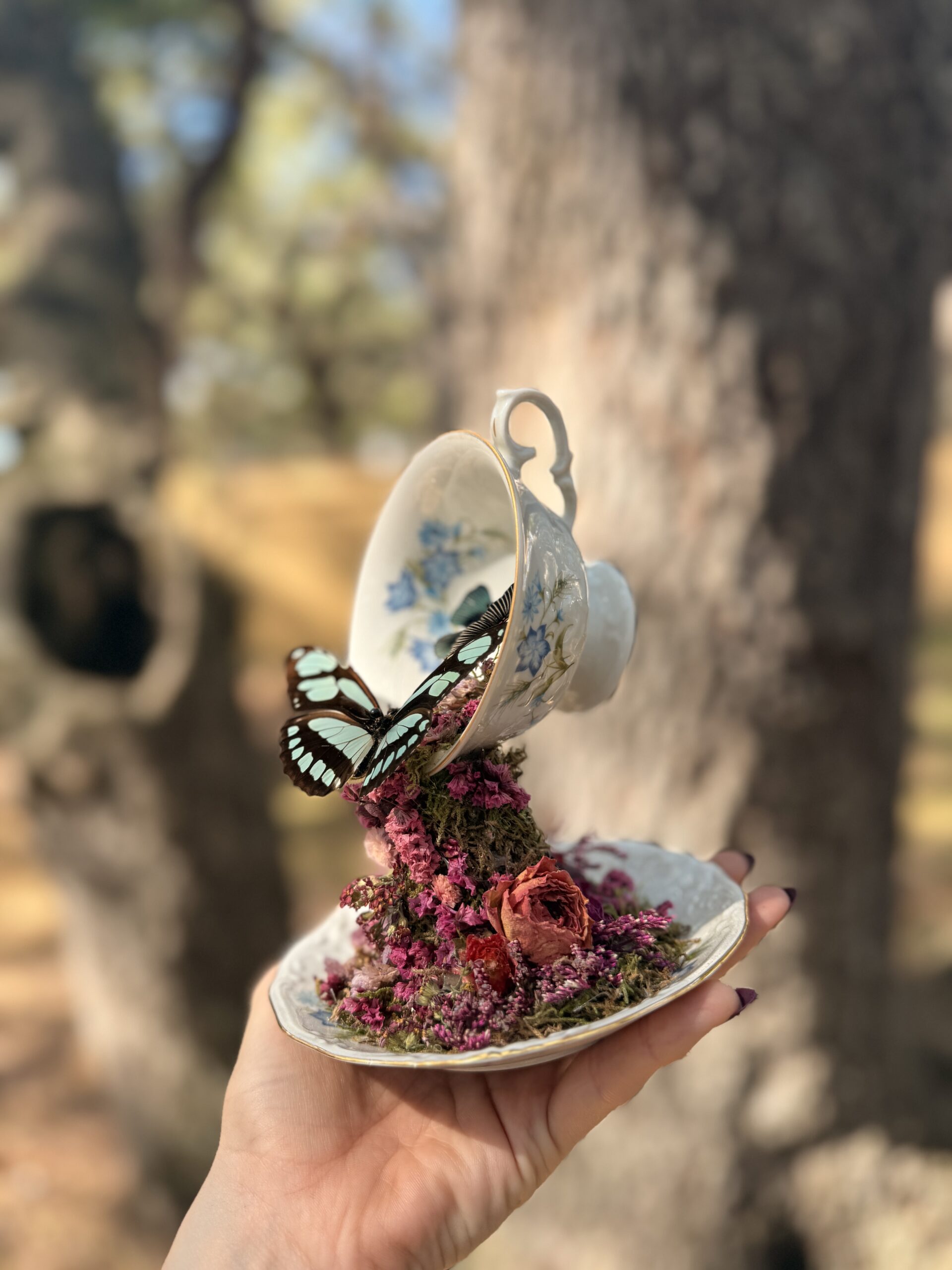 An antique china teacup appears to spill a small enchanted garden, with moss, roses, and wild florals flowing down in midair. Resting along the cascade are two luminous visitors, a Green Longwing and an Apollo Metalmark, turning the whole piece into a quiet moment of suspended magic.
